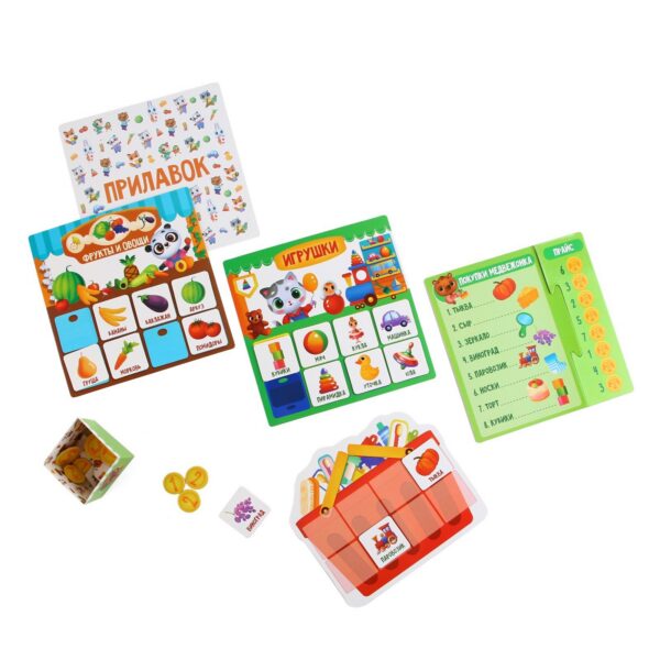 Игроки по очереди выбирают на столе по одному жетону и кладут его на свою корзину. Выбирать нужно только те продукты, которые есть в списке покупок ребёнка. Игра продолжается, пока все дети не заполнят свои корзины. Здесь нет победителей, ребята просто моделируют ситуацию похода в магазин.