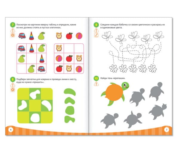 На каждой странице представлены яркие красочные картинки с разнообразными заданиями. Если использовать простой карандаш, одно и то же задание можно выполнять несколько раз, улучшая свой результат.